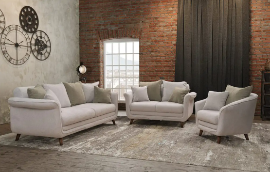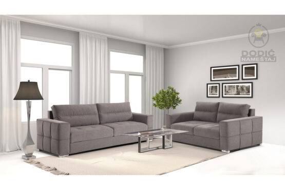 Garnitura modernog dizajna, sa drvenim nogarima. Sastoji se iz kompleta trosed, dvosed i fotelja.