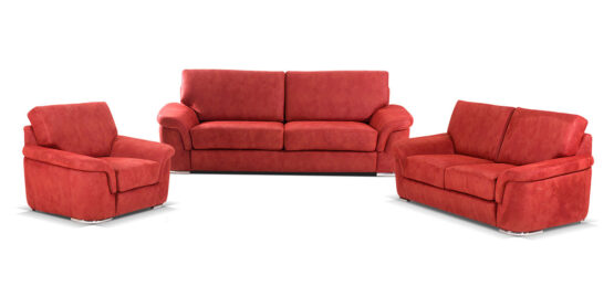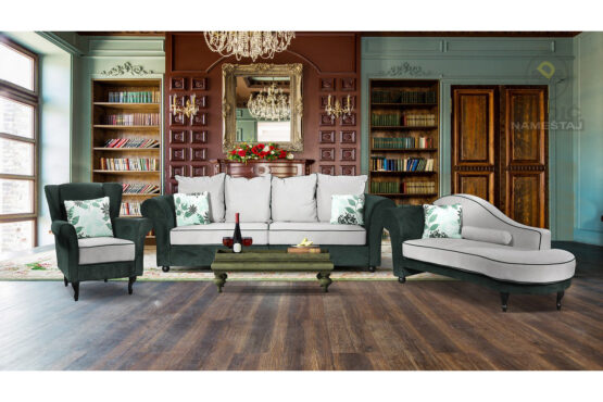Garnitura modernog dizajna, sa drvenim nogarima. Sastoji se iz kompleta trosed, dvosed i fotelja.