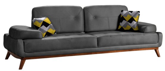 Garnitura modernog dizajna, sa drvenim nogarima. Sastoji se iz kompleta trosed, dvosed i fotelja.