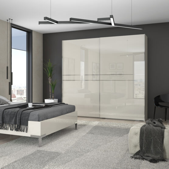• frontovi i bočne strane plakara lakirani su UV lakom u visokom sjaju, u toploj bež ili beloj boji u kombinaciji sa elegantnim horizontalnim hromiranim lajsnama;