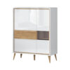 Komoda iz kolekcije VIDA, sa dva krila u kristalno beloj boji i tri fioke u drvo-dekoru Pacifik orah, dizajnirana je u stilu 60-tih godina. Ova komoda namenjena je ljubitelima nameštaja retro dizajna.