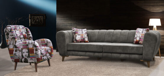 Garnitura modernog dizajna, sa drvenim nogarima. Sastoji se iz kompleta trosed, dvosed i fotelja. Postoji mogućnost kupovine zasebnih elemenata, kao i kombinacije boja, dezena… Veoma udobna, sedeći deo sunđer (gustina 30), koja se nalazi na elastičnim gurtnama koje povećavaju osećaj udobnosti. Veliki izbor materijala. Drvena konstrukcija omogućava čvrstoću i dugotrajnost, a drveni nogari stabilnost.