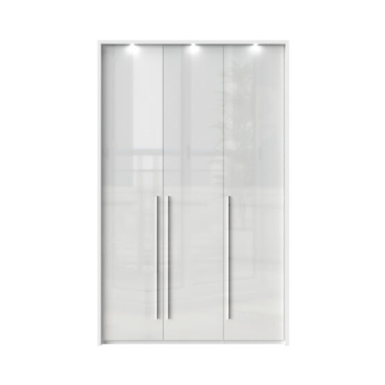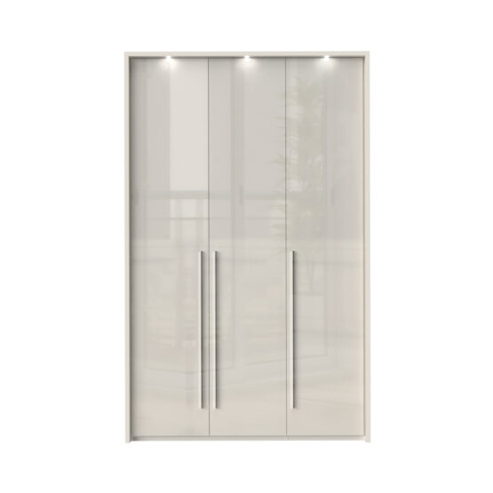 Funkcionalan trokrilni plakar dizajnirane geometrijske forme iz kolekcije nameštaja PIANO sa dekorativnom bočnom i pokrivnom lajsnom sa rasvetom