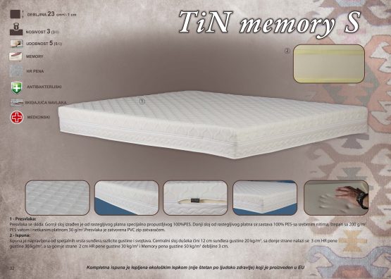 Centralni sloj dušeka čini 12 cm sunđera gustine 20 kg/m3, sa donje strane nalazi se 3 cm HR pene gustine 30 kg/m3, a sa gornje strane 2 cm HR pene gustine 30 kg/m3 i Memory pena gustine 50 kg/m3 debljine 3 cm.