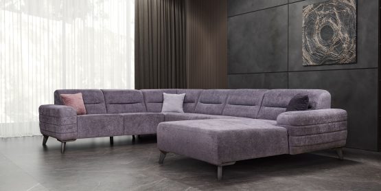 Ugaona garnitura modernog dizajna, sa drvenim nogarima. Mogućnost kombinovanja elemenata i veliki izbor dezena i boja materijala. Urađena u HR peni, veoma udobna.