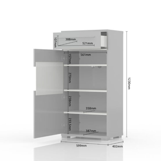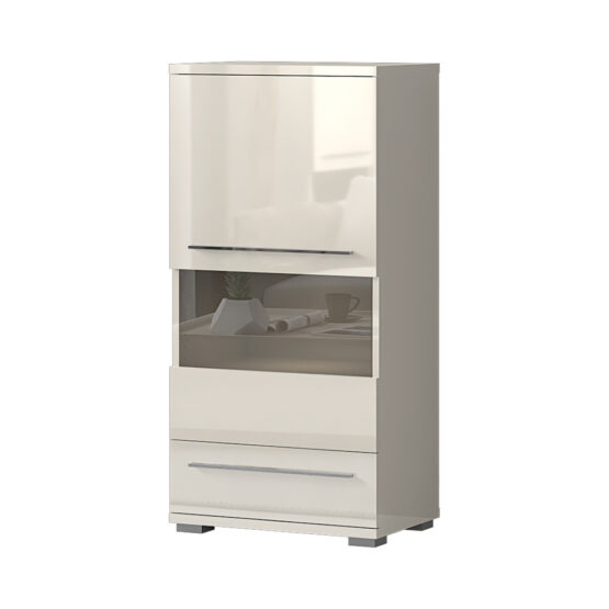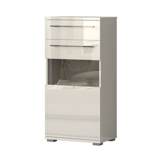 • Funkcionalna vitrina iz kolekcije nameštaja PIANO sa jednim staklenim krilom I jednom fiokom, dizajnirane geometrijske forme.
