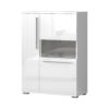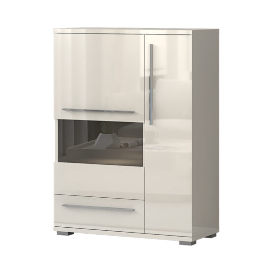 - Funkcionalna vitrina sa jednim punim I jednim staklenim krilom I jednom fiokom, dizajnirane geometrijske forme.